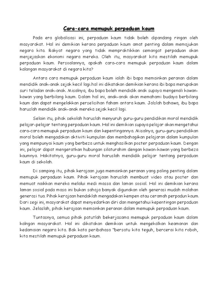 Topik-topik perpaduan boleh. Aktiviti kokurikulum yang dilaksanakan seperti sukan kelab dan persatuan dan ceramah haruslah dipergiat dan dipertingkatkan. Contoh Karangan SPM -cara mengukuhkan perpaduan kaum.